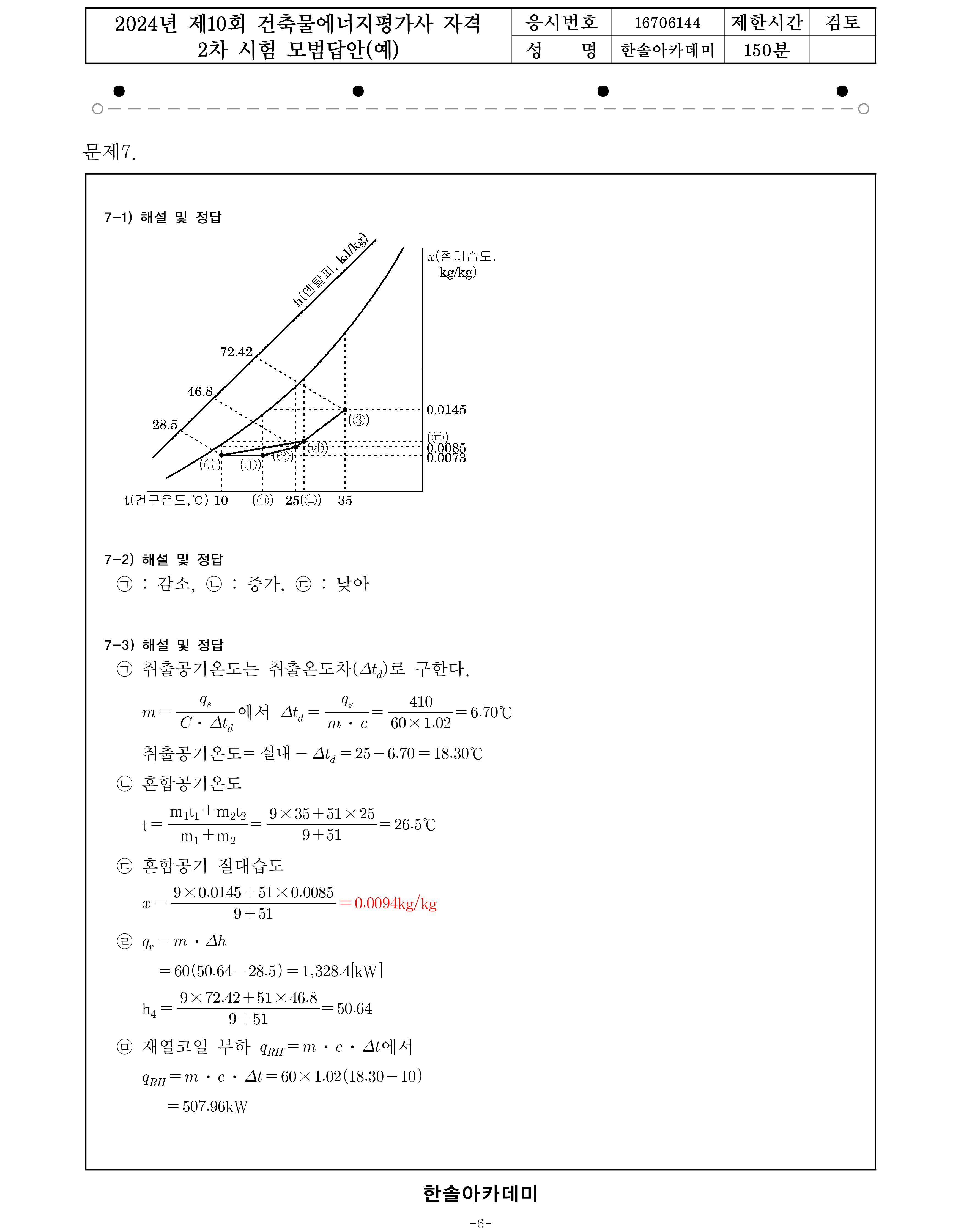 아래의 모범답안은 2024년 건축물에너지평가사 실기시험 출제문제에 대해 우선 궁금해하는 수험생분들에 대한 이해를 돕기 위해 한솔아카데미에서 제시하는 모범답안이오니 참고하여주시기 바랍니다.