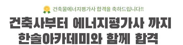 2020년도 회사 퇴직 후 평소 관심이 있어서 시험 공부를 하였던 에너지 평가사를 적극적으로 공부를 시작했습니다. 19년도에 1차를 한번 떨어진 상태에서 한솔학원을 접하게 되었고 퇴직전 본사 대기를 하면서 본격적으로 공부를 하기 시작하였습니다. 건축전공으로 시험과목중 기계설비 문제와 전기관련 문제는 생소하게 다가왔습니다. 시공 현장에서 10년동안 타 공종으로만 접하다가 실제로 공부를 함으로써 실제 시공업무를 하는 것에도 보다 관심을 가지고 업무에 임할 수 있었습니다. 자신의 개인적인 시각을 조금 더 넓혀주는 계기가 되었습니다.