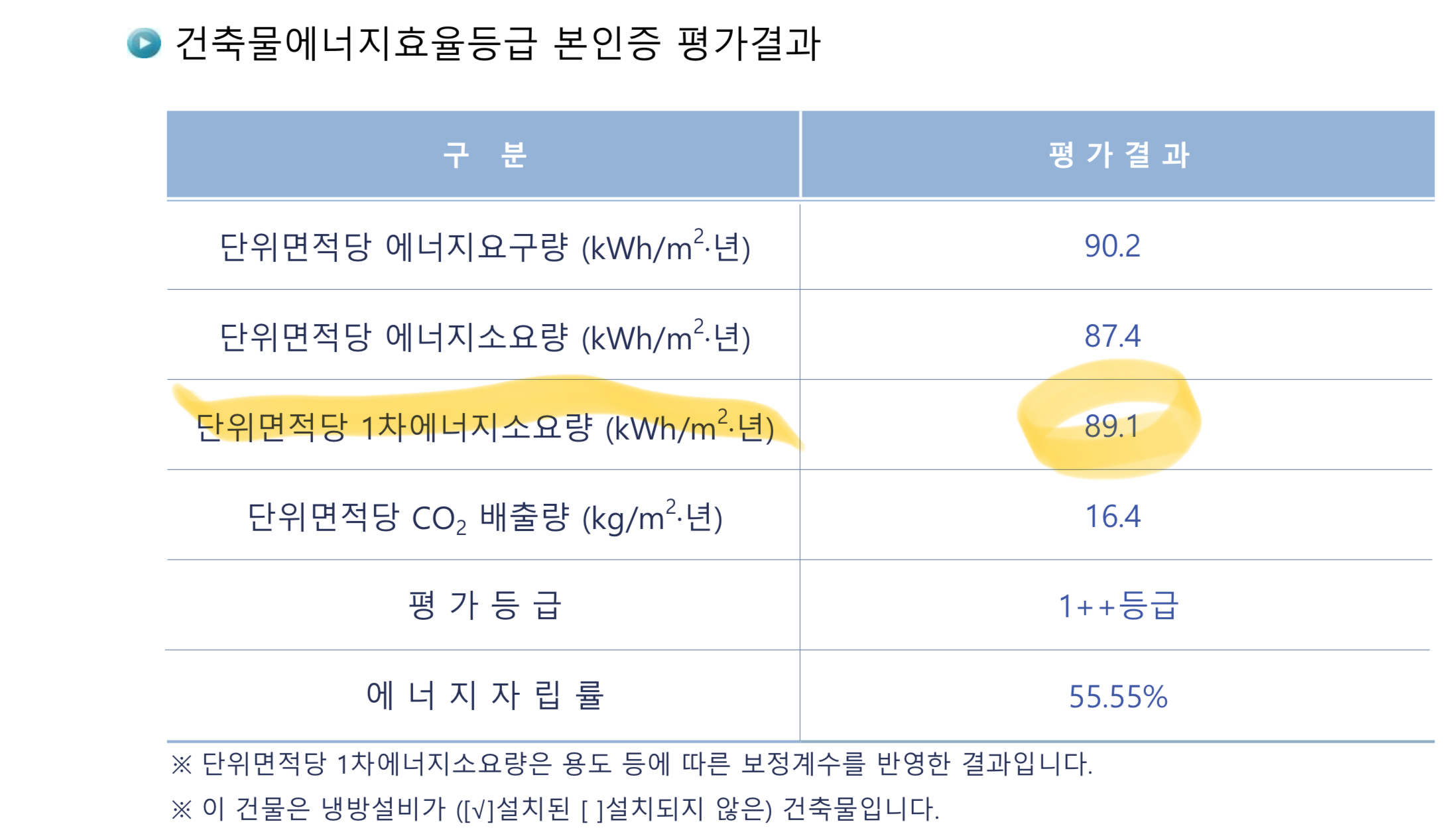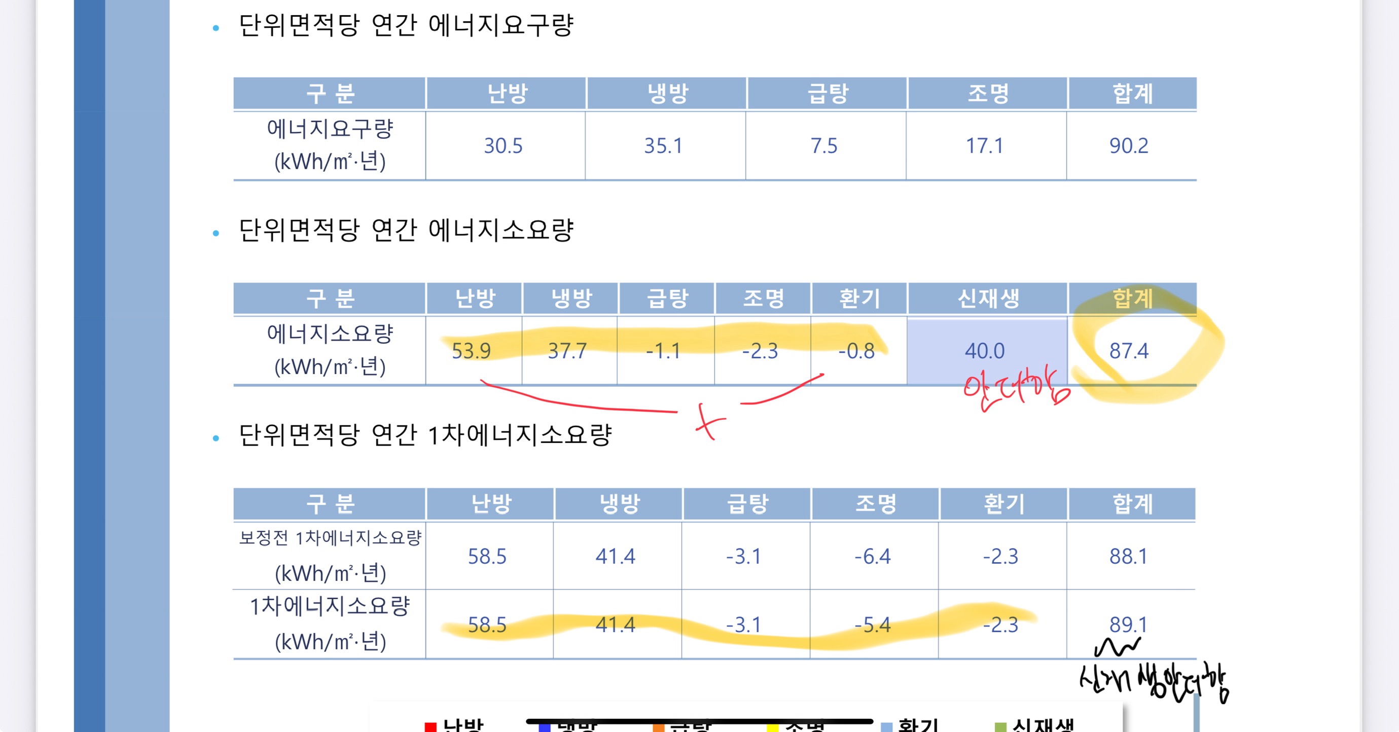 아래 인증서 예시에 보시다피 신재생에너지생산량은 자립률을 산정하기 위한 값이고 1차에너지소요량에서는 신재생에너지 생산량을 계산에서 더하지 않는데 문제풀이가 이해가 안되서 문의드립니다
