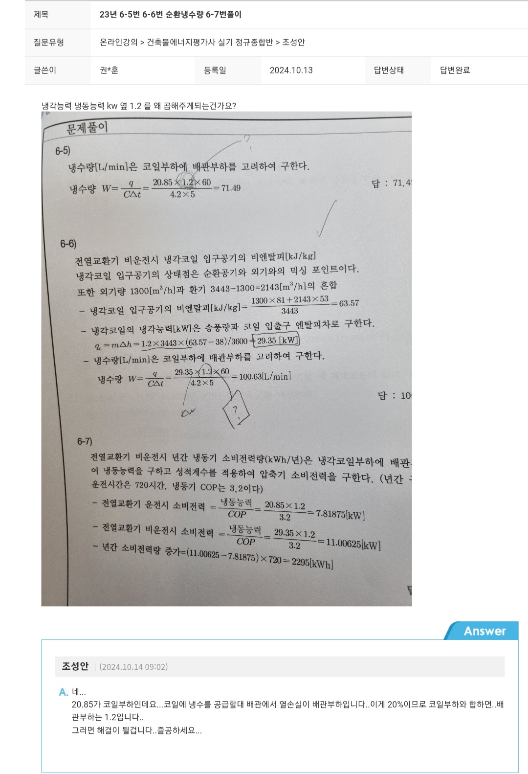 문제 조건이 냉각코일이 아닌 냉동기 순환냉수량으로 바뀌어야 해설과 동일하다 판단합니다